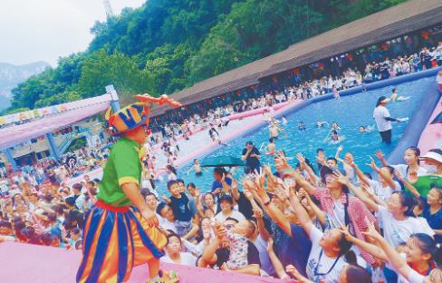 與此同時,云臺山親子戲水嘉年華也盛大開啟,一場水上盛宴瞬間點燃夏日激情。走進云臺山的小寨溝游人廣場,上萬平方米的清涼池宛如歡樂的海洋。水槍大戰、潑水狂歡接連上演,水花四濺中滿是歡聲笑語;動感女團帶來活力四射的舞蹈,滑稽小丑與游客親密互動,現場氛圍被徹底點燃;風馳電掣的機車表演、色彩斑斕的馬卡龍系皮卡展示以及充滿歡樂的彩虹跑等活動,將潮玩元素與自然風光完美融合,為云臺山增添了獨特魅力。這場集清涼、潮玩、親子互動于一體的夏日狂歡盛宴,讓游客沉浸式感受戲水活動的獨特魅力,留下難忘的夏日記憶。