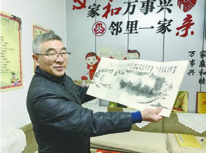 汪洪海展示他創(chuàng)作的紅色書(shū)畫(huà)作品。