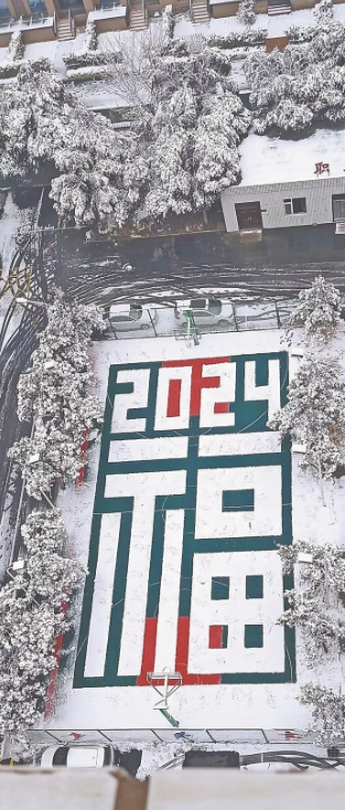 焦作保安再發力用雪寫成一個籃球場大的福字