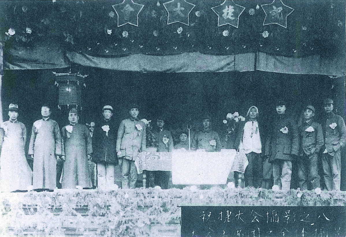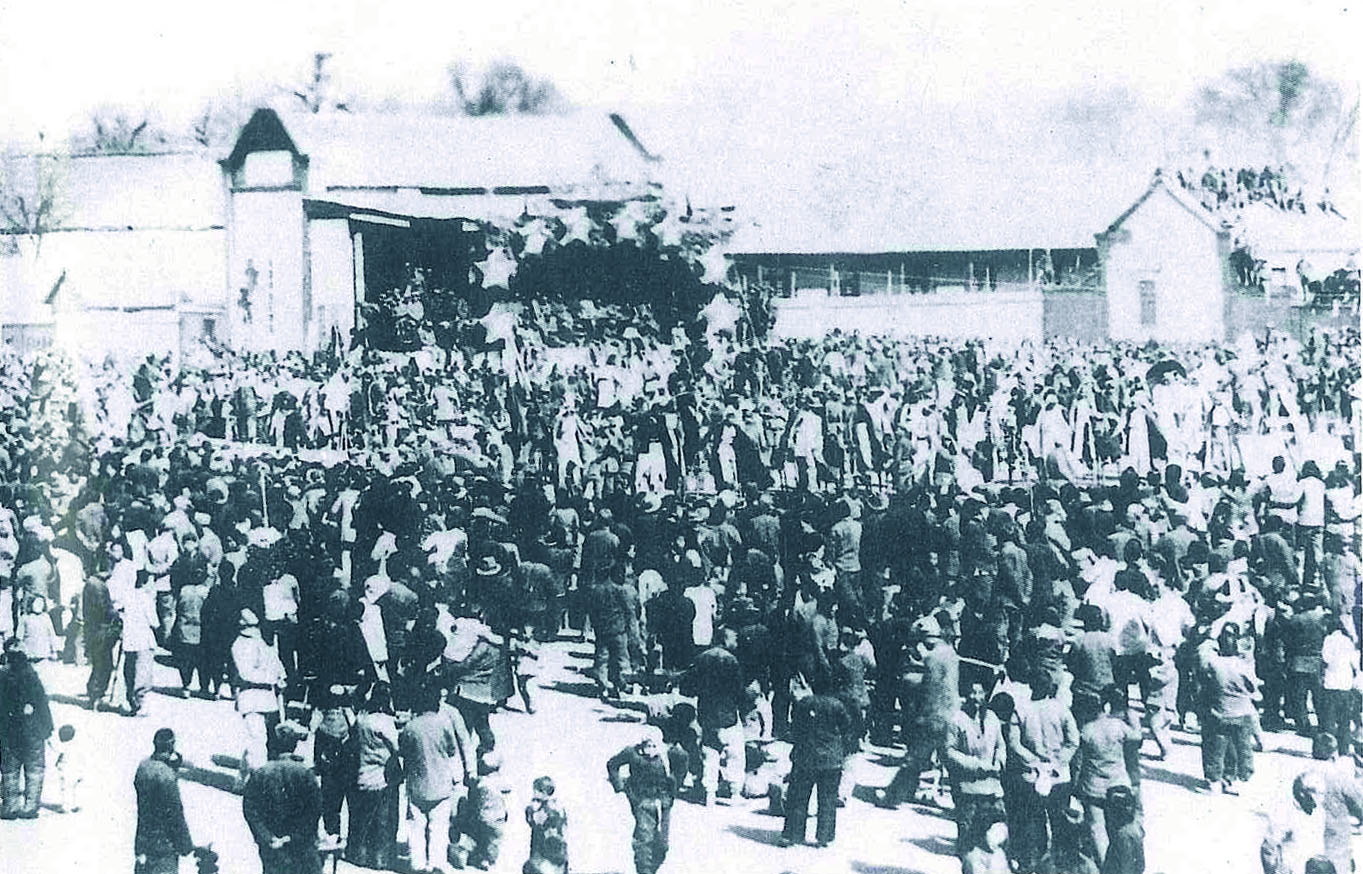 1945年9月抗日戰爭勝利后,我軍民在焦作廣場(今焦作貿易大廈處)召開萬人祝捷大會。