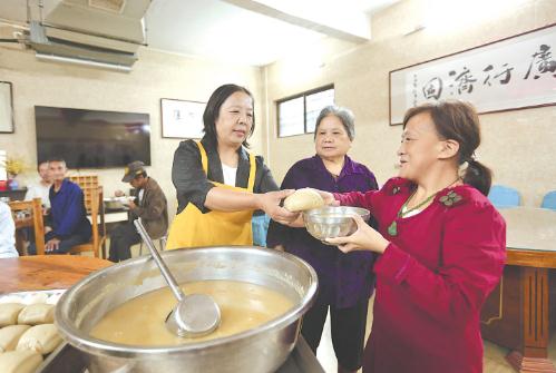 楊應芬(右三)在給孤寡老人和殘疾人盛飯。記者 王夢夢 攝