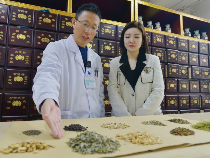 在“焦作中醫(yī)大講堂”欄目錄制現(xiàn)場,焦作市名中醫(yī)(左)為記者講解防治甲型流感的中藥配方。
