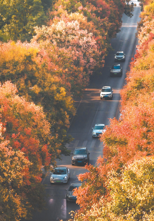 騎行在青云大道上,兩側柿子樹碩果低垂,青黃相間的柿子如燈籠綴滿枝頭,與欒樹的繽紛相映成趣。微風過處,欒樹花簌簌飄落,少年騎車碾過金色花毯,驚起幾只啄食的麻雀。