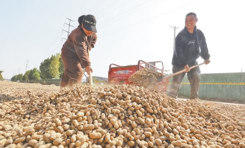 連日來,溫縣廣大農民緊抓降雨間歇,多措并舉搶收搶烘搶曬秋糧。圖為10月21日,溫縣黃河街道張王莊東村村民在攤曬花生。
