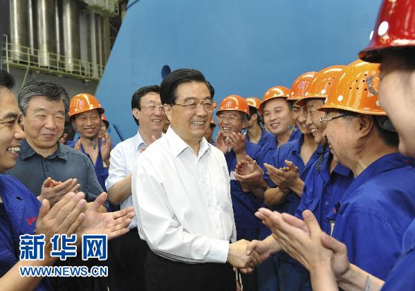 7月9日至11日,中共中央總書記、國家主席、中央軍委主席胡錦濤在河南省考察工作。這是胡錦濤同中信重工機械股份有限公司干部職工親切交談,勉勵他們不斷增強自主創新能力,全面提升企業競爭力,努力在世界裝備制造業占有一席之地。新華社記者 李學仁 攝