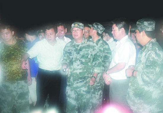 昨日18時30分左右,大雨突襲我市,烈士街道清小學(xué)西50米路南的路面發(fā)生塌陷,出現(xiàn)一個直徑約3米、深3米左右的大坑,給居民出行帶來了不便。得知情況后,焦作軍分區(qū)司令員闞輝(前排中)、參謀長董建亞立即組織解放區(qū)負(fù)責(zé)人以及民兵參加搶險,并冒雨到現(xiàn)場指揮。 李英俊 楊 銘 攝
