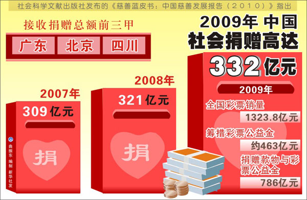 昨天發布的《慈善藍皮書》指出,2009年我國社會捐贈量達332億元,增長3.5%。鄭遠長預計,今年的常規捐款數量大概能達到500億元。但依照《藍皮書》的對比,2009年,中國、美國、英國、巴西、印度五個國家中,捐贈占GDP比重,中國最低。