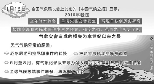 1月12日,中國氣象局發(fā)布《2010年中國氣候公報》。公報顯示,2010年我國極端高溫和強降水事件發(fā)生之頻繁、強度之強、范圍之廣歷史罕見,是本世紀(jì)以來我國氣候最異常的一年。