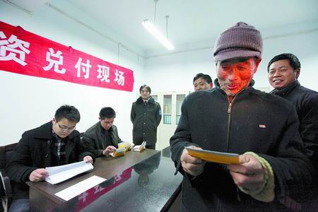 資料圖片:領(lǐng)到拖欠工錢的農(nóng)民工笑了。