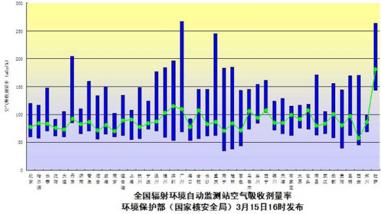 環境保護部(國家核安全局)有關負責人今日介紹說,環境保護部(國家核安全局)3月15日16時發布全國省會城市和部分地級市輻射環境自動監測站實時連續空氣吸收劑量率監測值。該負責人介紹,監測結果匯總圖中綠色曲線代表監測值,藍色柱體代表天然本底水平,綠色曲線均在藍色柱體范圍內。監測結果表明中國輻射環境水平未受到日本核電事故的影響。