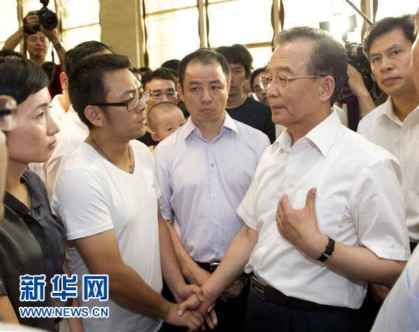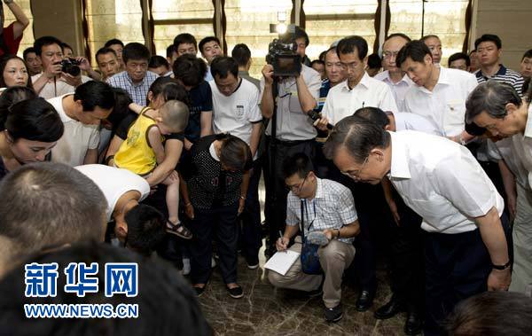 溫家寶來到金球國豪酒店看望部分死傷人員家屬。新華社記者 黃敬文 攝