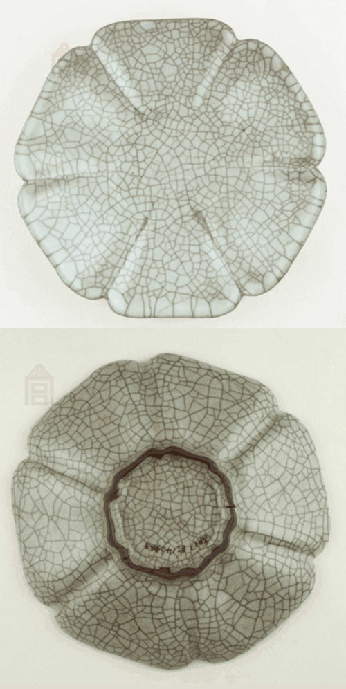 昨天,央視《共同關注》節目中播放了其拍攝到的破碎文物圖片。從圖片中可以看到,文物破碎成了幾片,情況較為嚴重。故宮方面則表示,文物依然有希望修復。但有細心網友表示,在故宮的官網上,哥窯青釉葵瓣口盤呈六瓣葵花式,淺腹,坦底。腹壁向里凸出6道棱線,圈足亦隨腹壁起伏變化。通體施青灰色釉,釉面開細碎片紋。圈足露胎處呈黑褐色(圖1)。而在央視公布的正視圖和背視圖中,并沒有出現腹壁向里凸出的6道棱線,而且圈足是圓的,也不是像資料照片中隨腹壁起伏變化,最為重要的是圈足露胎處沒有呈現黑褐色(圖2)。更細心的網友還比較了兩件瓷器背后的故宮檔案編號。