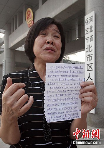 王朝的母親楊惠賢昨天也隨律師到了保定,她說,在王朝案重審判決書中,北市區法院合議庭只對辯方辯護觀點予以否認,并未提及辯方證據,也沒有表示對這些證據的態度。