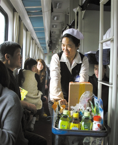 2011年2月8日,青島至哈爾濱的K702次列車上,一名乘務(wù)員在賣水。馬成軍 攝