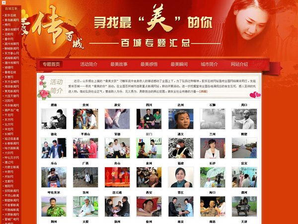 12月1日,為了弘揚(yáng)山東煙臺(tái)“最美女孩”刁娜舍身救人的精神,由百家城市網(wǎng)站參與的“愛傳百城——尋找最美的你”活動(dòng)在煙臺(tái)廣播電視大廈啟動(dòng)。中國網(wǎng)盟各成員單位在網(wǎng)站首頁同步推出來自全國各地不同行業(yè)、不同階層的“最美”人物,一個(gè)個(gè)愛心故事迅速在互聯(lián)網(wǎng)上傳播。