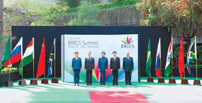 3月29日,金磚國家領導人第四次會晤在印度新德里舉行。這是胡錦濤主席同巴西總統羅塞夫、俄羅斯總統梅德韋杰夫、印度總理辛格、南非總統祖馬合影。
