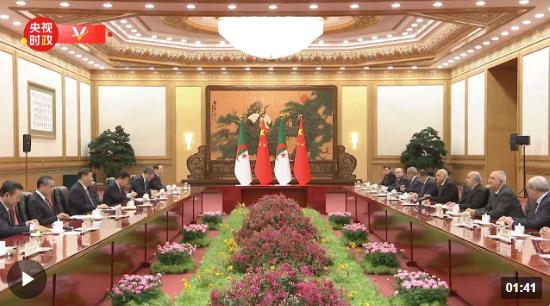 習近平指出,今年是中阿建交65周年。65年前,反對帝國主義和殖民主義、爭取民族獨立解放的共同事業使我們兩國走到一起。65年來,中國和阿爾及利亞始終患難與共、守望相助,兩國的友誼歷久彌堅。新征程上,中方愿同阿方一道努力,賡續傳統友誼,加強戰略溝通,深化交流合作,推動中阿全面戰略伙伴關系行穩致遠。