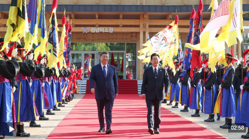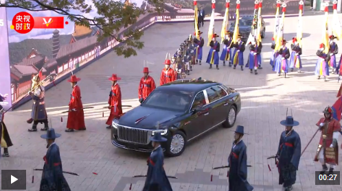 獨家視頻丨習近平乘車抵達慶州博物館 韓國總統熱情迎接