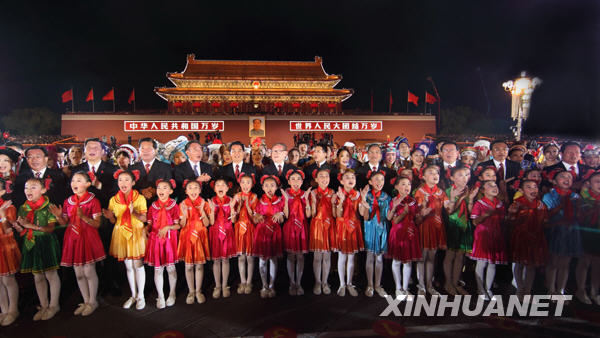 10月1日晚,首都各界群眾在北京天安門廣場舉行盛大聯歡晚會,熱烈慶祝中華人民共和國成立60周年。黨和國家領導人胡錦濤、江澤民、吳邦國、溫家寶、賈慶林、李長春、習近平、李克強、賀國強、周永康等同各界群眾共同歡度國慶之夜。新華社發