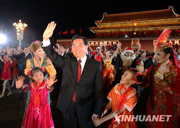 10月1日,首都各界慶祝中華人民共和國成立60周年聯歡晚會在北京天安門廣場舉行。這是中共中央總書記、國家主席、中央軍委主席胡錦濤走出天安門城樓,來到群眾中間。新華社記者 蘭紅光 攝