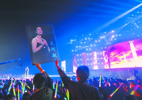 | ↑河南理工大學師生將著名歌星沙寶亮的照片高高舉起。 本報記者 劉 璐 攝 |