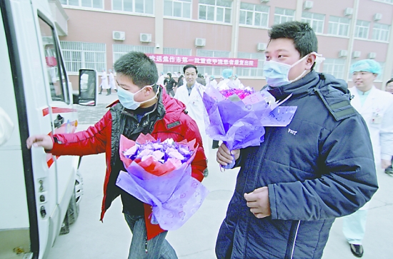 在昨日的歡送儀式上,康復者小強(化名)認出了曾救治過他的市甲型H11N流感醫療救治專家組成員、市第三人民醫院隔離病區主任趙宇亮,他立即擁抱著趙宇亮說:“這回我可看清你長啥樣了!”