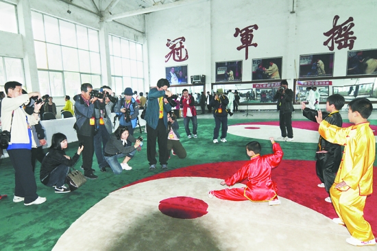 昨日下午,在陳家溝武術院,太極拳師和小太極手們精彩的太極拳表演讓韓國客人大飽了眼福。一個七八歲的“太極小子”更是成了全場焦點,許多韓國的攝影家和媒體記者都追著給他拍照,韓國傳統藝術團的兩位美女“粉絲”也急急忙忙找來翻譯,要求和這位小弟弟合影。