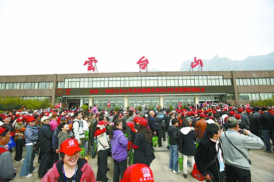 本報(bào)訊(記者高新忠)4月24日9時(shí)30分許,隨著市委常委、副市長趙建軍鳴響發(fā)令槍,北京至焦作云臺(tái)山號(hào)系列旅游專列2010年首發(fā)團(tuán)的游客走進(jìn)云臺(tái)山,開始了他們?yōu)槠趦商斓目鞓分谩T婆_(tái)山景區(qū)在百家?guī)r山門廣場為首發(fā)團(tuán)游客舉行了隆重的歡迎儀式,市人大常委會(huì)副主任宮素清出席歡迎儀式。