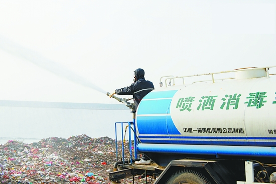 壓題照片 市垃圾處置站工作人員及時對運來的垃圾進(jìn)行消毒。 王龍卿 攝