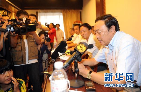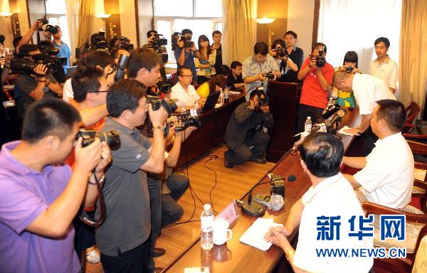 8月26日,一位記者試圖在新聞通氣會結束后,采訪河南航空公司監事會主席劉航(右),但對方沒有接受采訪。當日,伊春飛機失事首次新聞通氣會在黑龍江省伊春市召開。相關部門人員介紹了事故情況、救援進展和善后處理等情況,但沒有回答記者提問。新華社記者 邢廣利 攝