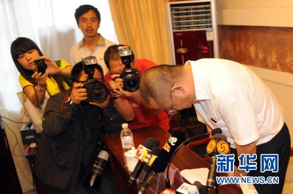 8月26日,河南航空公司監事會主席劉航在新聞通氣會上鞠躬致歉。當日,伊春飛機失事首次新聞通氣會在黑龍江省伊春市召開。相關部門人員介紹了事故情況、救援進展和善后處理等情況,但沒有回答記者提問。新華社記者 邢廣利 攝