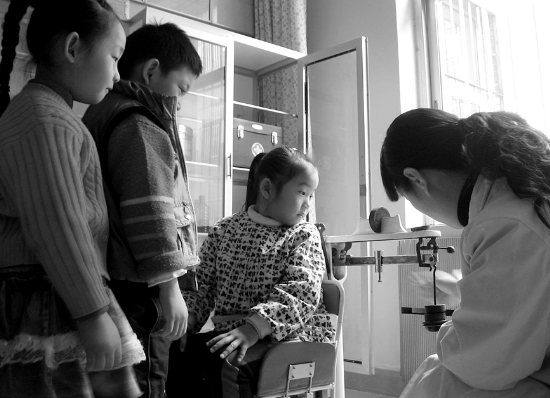 上圖 市實驗幼兒園醫務室里,保健醫生正在為小寶寶們作例行體檢。