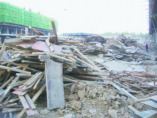 11月19日下午,沿著龍?jiān)春䥽?guó)際廣場(chǎng)二期工程正對(duì)大門口的一條東西方向道路進(jìn)入工地后,在第一個(gè)十字路口向北拐,眼前呈現(xiàn)出一片混亂的景象:各種鋼管、三合板、木料等材料,橫七豎八地堆放在兩棟樓之間的路面上。其中一個(gè)警示牌西側(cè)的兩棟樓之間被凌亂的木板、鋼管塞得“水泄不通”,施工人員要么繞行,要么踩著木板堆才能到達(dá)西圍墻處的生活區(qū)。