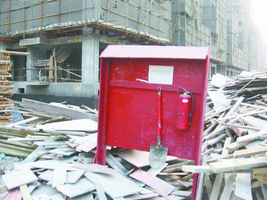 按照這位施工人員的提醒,記者看到,在“文明施工”警示牌西南側(cè)4米,有一個(gè)木質(zhì)報(bào)刊亭狀的消防設(shè)備存放點(diǎn),偌大的存放點(diǎn)僅放著一把消防鐵鍬和一個(gè)干粉滅火器,而該消防設(shè)備存放點(diǎn)的四周卻橫七豎八堆放著木料、鋼管等物。