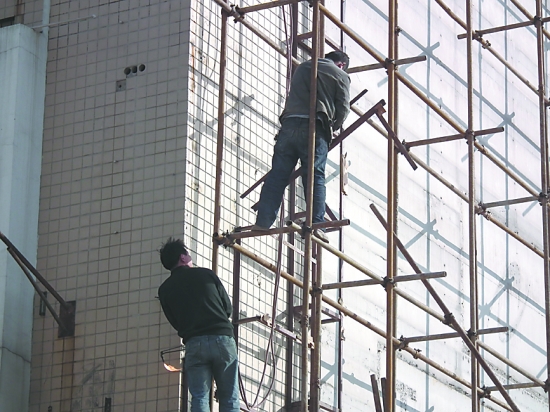 昨日下午,在大楊樹(shù)商業(yè)街同一首歌KTV裝修工地現(xiàn)場(chǎng),2名施工人員在沒(méi)有任何防護(hù)設(shè)施的情況下,站在離地面約5米高的鋼管架上,拿著電焊切割原來(lái)的廣告架,產(chǎn)生的火花直接落在了地面上零落的木版、紙屑上……