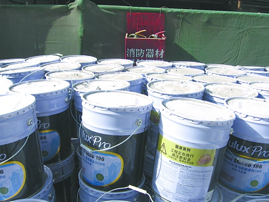 據(jù)了解,這一情況在市區(qū)其他在建工地也很多見(jiàn)。如建業(yè)森林半島三期工程建筑工地的一個(gè)消防設(shè)備存放點(diǎn),就被桶裝的墻壁涂料擋在了里面。