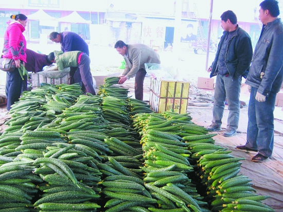 市場里,車水馬龍,一片忙碌景象。當(dāng)?shù)夭宿r(nóng)開著一輛輛滿載著一筐筐黃瓜、西葫蘆、青椒、西紅柿等蔬菜的三輪摩托車,向蔬菜交易市場攤位駛?cè)ィ皇卟私?jīng)紀(jì)人一邊和已停在自己攤位前的菜農(nóng)談價(jià)錢,一邊招呼剛駛過來的菜車停在自己的攤位前……