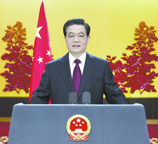 新年鐘聲即將敲響,人類就要進入2011年。在這辭舊迎新的美好時刻,我很高興通過中國國際廣播電臺、中央人民廣播電臺和中央電視臺,向全國各族人民,向香港特別行政區同胞、澳門特別行政區同胞、臺灣同胞和海外僑胞,向世界各國的朋友們,致以新年的祝福!