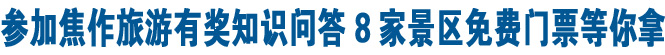 本報訊 (記者王愛紅) 你想獲得云臺山、神農山、青天河、青龍峽景區免費門票的話,5月19日“中國旅游日”當天去市東方紅廣場參加焦作旅游有獎知識問答吧,我市8家旅游景區的700多張免費門票等著你來拿!