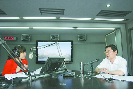 市委書記路國賢做客河南人民廣播電臺《政府在線》節目現場。 本報記者 攝 |
