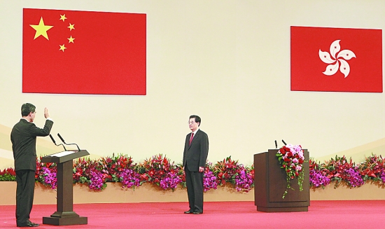 | 7月1日,中共中央總書記、國家主席、中央軍委主席胡錦濤出席慶祝香港回歸祖國15周年大會暨香港特別行政區第四屆政府就職典禮。這是由胡錦濤監誓,香港特別行政區第四任行政長官梁振英宣誓就職。 鞠 鵬 攝 (新華社發) |