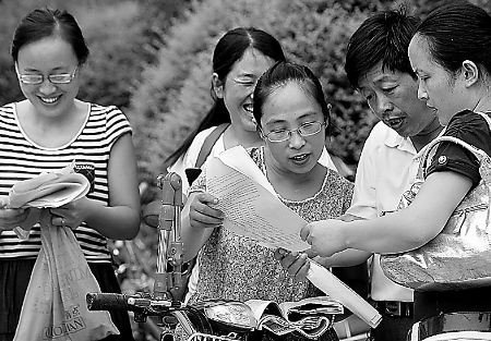 8月9日,鄲城縣一高剛走出考場的幾名教師正在交流應試答題情況。該校每年都要利用假期對教師進行兩次培訓,并進行學科知識測試,從而提升教學水平。今年,這個縣級高中考上清華大學、北京大學的學生就達23名。本報記者 王天定 攝