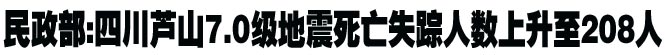 民政部:四川蘆山7.0級地震死亡失蹤人數上升至208人