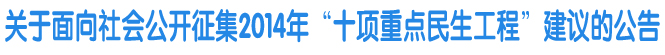 從2005年起,市委、市政府堅持每年向全市人民公開承諾辦好涉及人民群眾切身利益的“十項重點民生工程”,取得了顯著成效,得到了廣大人民群眾的擁護和支持。為全面貫徹黨的十八大、十八屆三中全會精神,深入落實科學發展觀,扎實推進黨的群眾路線教育實踐活動,加快經濟轉型示范市建設,切實解決人民群眾最關心、最直接、最現實的利益問題,市委、市政府決定2014年集中財力,再實施一批事關人民群眾切身利益的民生工程。根據市委、市政府部署,為擬定好2014年“十項重點民生工程”,提高政府工作的透明度和群眾的參與度,確保各項民生工程更加符合民意、更加富有成效,決定在全市范圍內開展向人民群眾和社會各界征集2014年“十項重點民生工程”建議活動。現就有關事項公告如下: