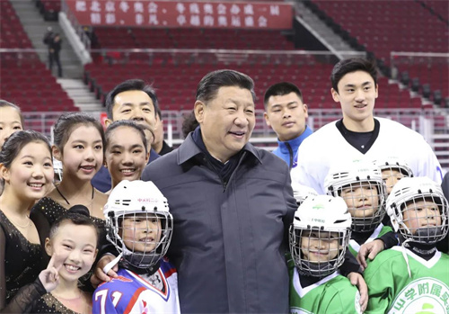 2017年2月24日,習(xí)近平在北京五棵松體育中心熱情勉勵青少年冰球和隊列滑愛好者們。(圖源:新華社)